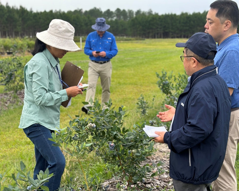 2024年 アメリカ・ジョージア大学アラパハ農場を訪問し、シュウ博士にお会いしました。開発中の品種を含む多数のブルーベリーをご紹介いただき、品種特性について意見交換を行いました。果径28mm級のジャンボ果実も現地で確認しました。